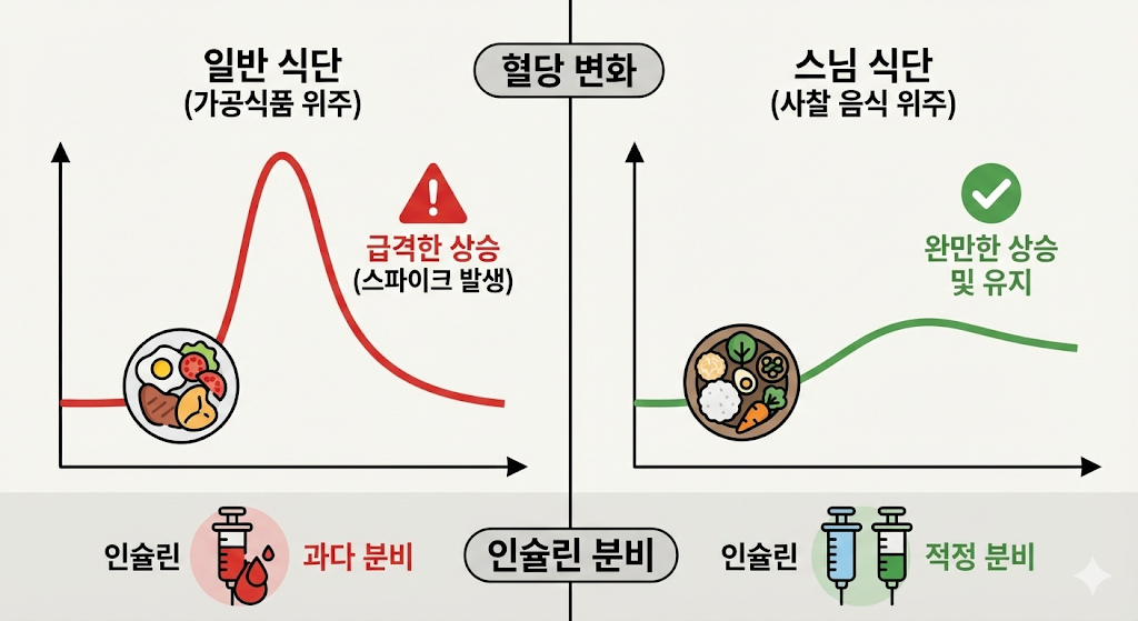 | 구분 | 일반 식단 (가공식품 위주) | 스님 식단 (사찰 음식 위주) |