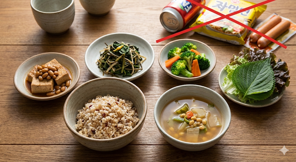 - 점심: 잡곡밥 + 제철 나물 3종 + 청국장(건더기 위주)
