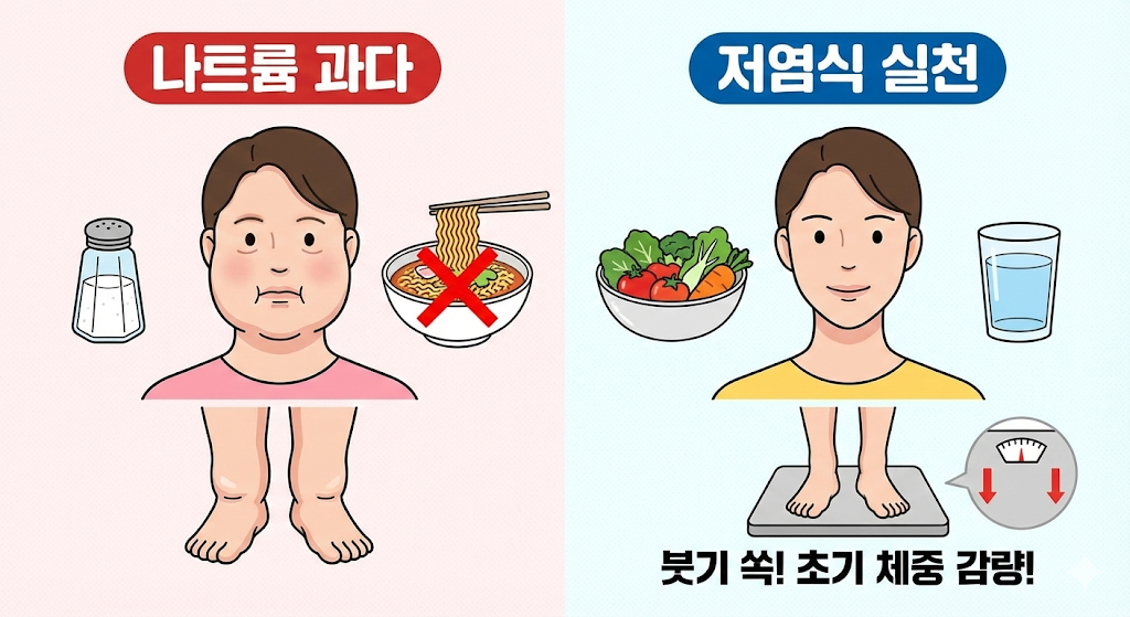 저염식으로 전환하면 체내 수분 저류가 줄어들어 초기 체중이 빠르게 감소합니다.
